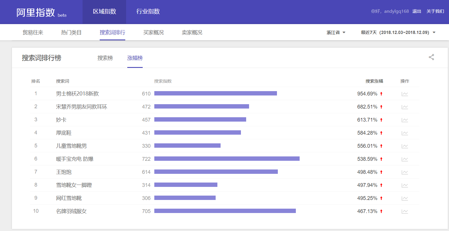5、在搜索詞排行的漲幅榜中可以看到浙江市場上升較快的品類