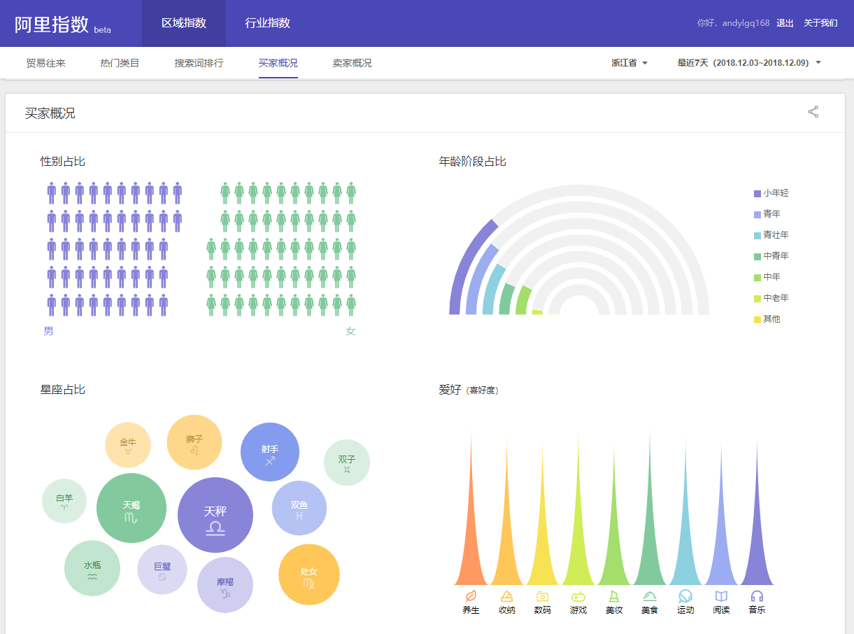 6、在買家概況可看到浙江區(qū)域買家群體的概況分析