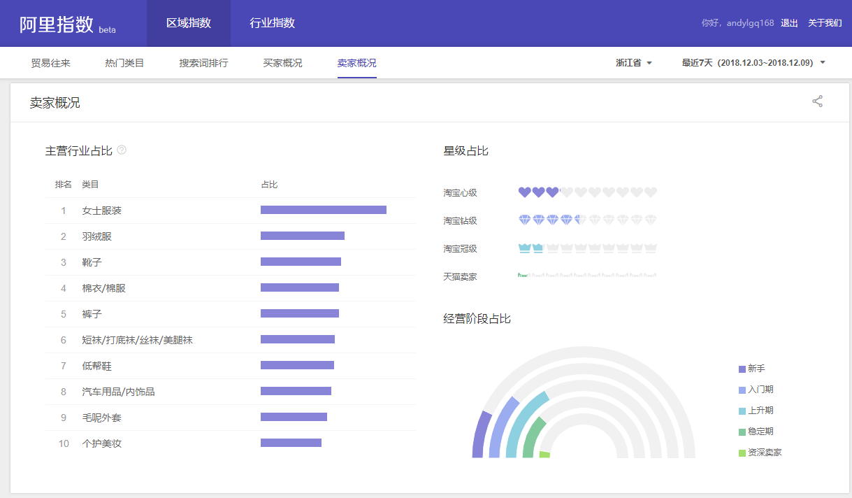 7、在賣家概況可看到浙江區(qū)域賣家群體的概況分析
